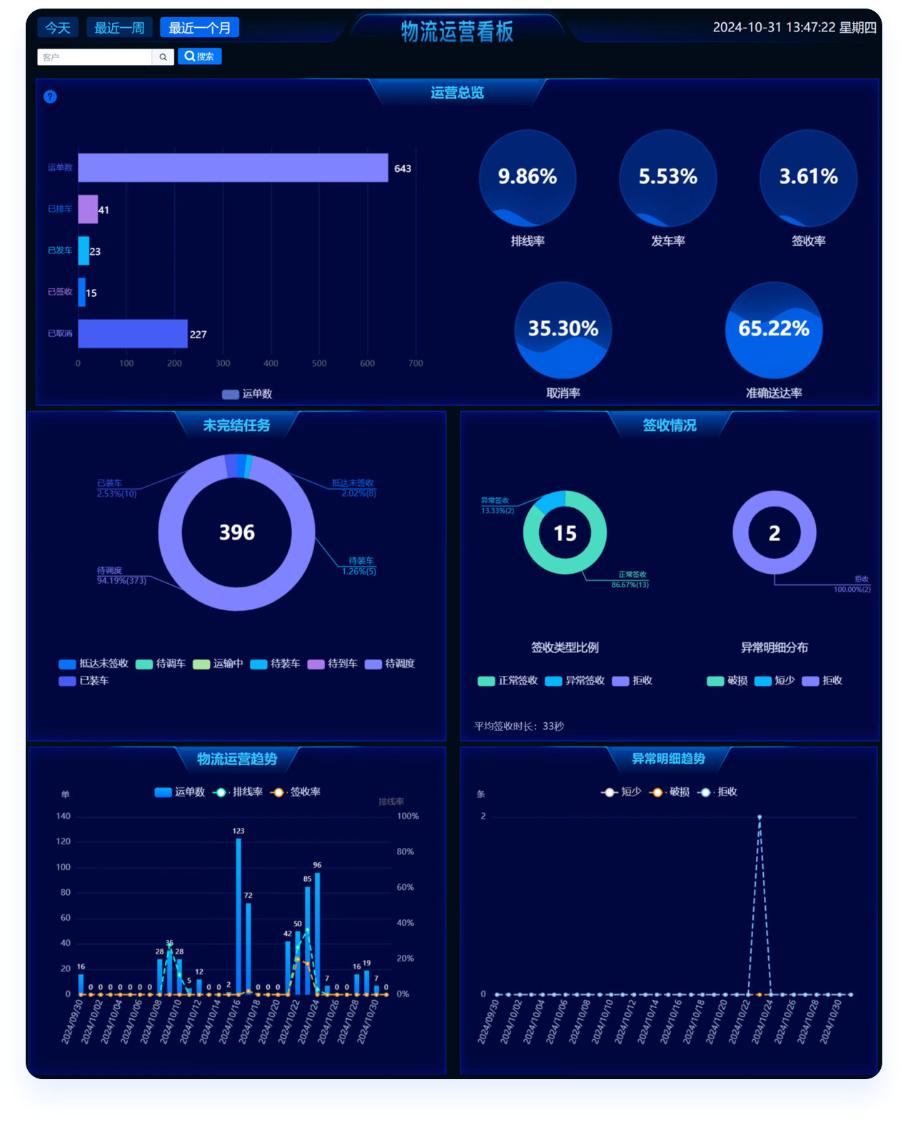 运输数据大屏通过高度集成和实时更新,清晰展示运单、排线、 与签收等情况,避免延误和错误,提升物流管理效率。