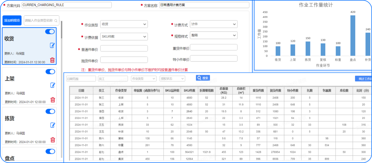通过全场景、多维度的工作量统计和多样化的计酬方案,我们为 收货员和拣货员提供精准的绩效激励