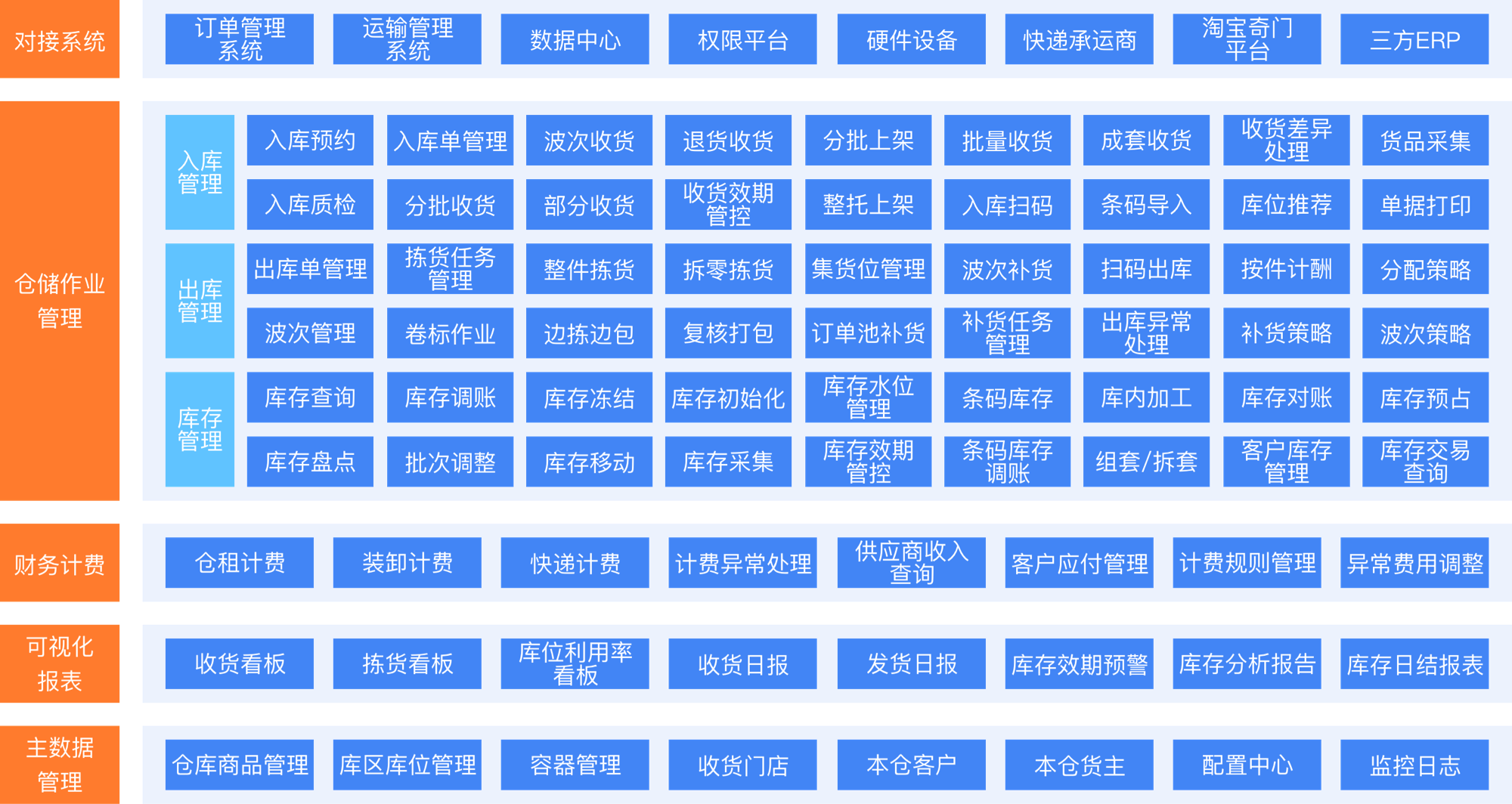 8个核心功能,支持万级SKU的入库、在库和出库高效运营和智能管理。